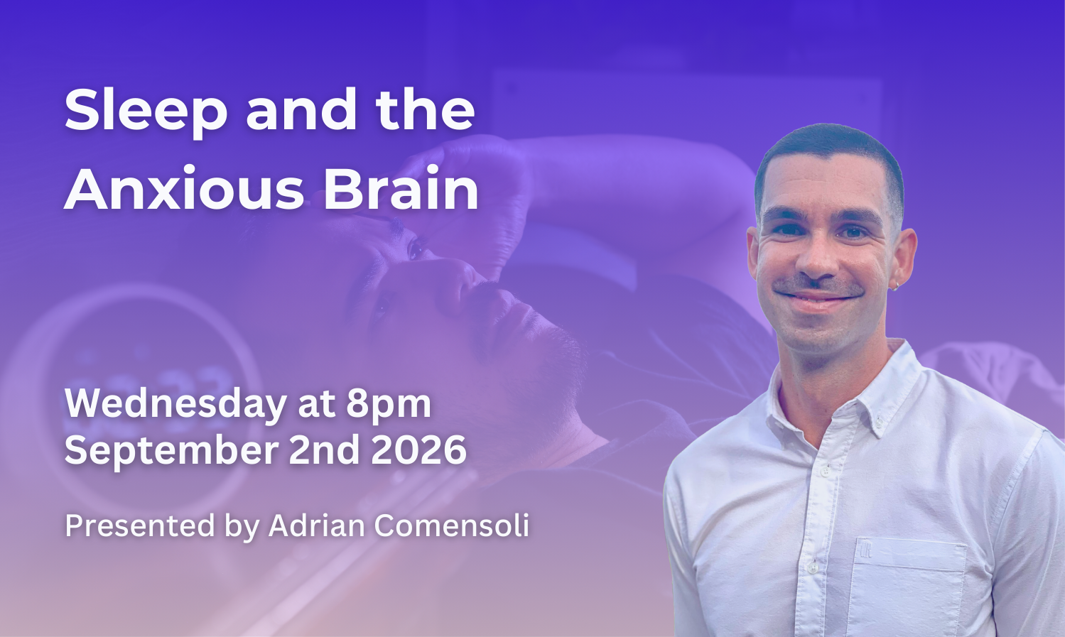 In this live online session, Psychologist Adrian Comensoli will explore the relationship between anxiety and sleep, share practical strategies to calm the mind at night, and help you develop a more supportive approach to rest. This discussion caters to anyone seeking practical insights , whether you’re personally experiencing sleep challenges, supporting a loved one, or simply wanting to better understand the connection between anxiety and sleep.